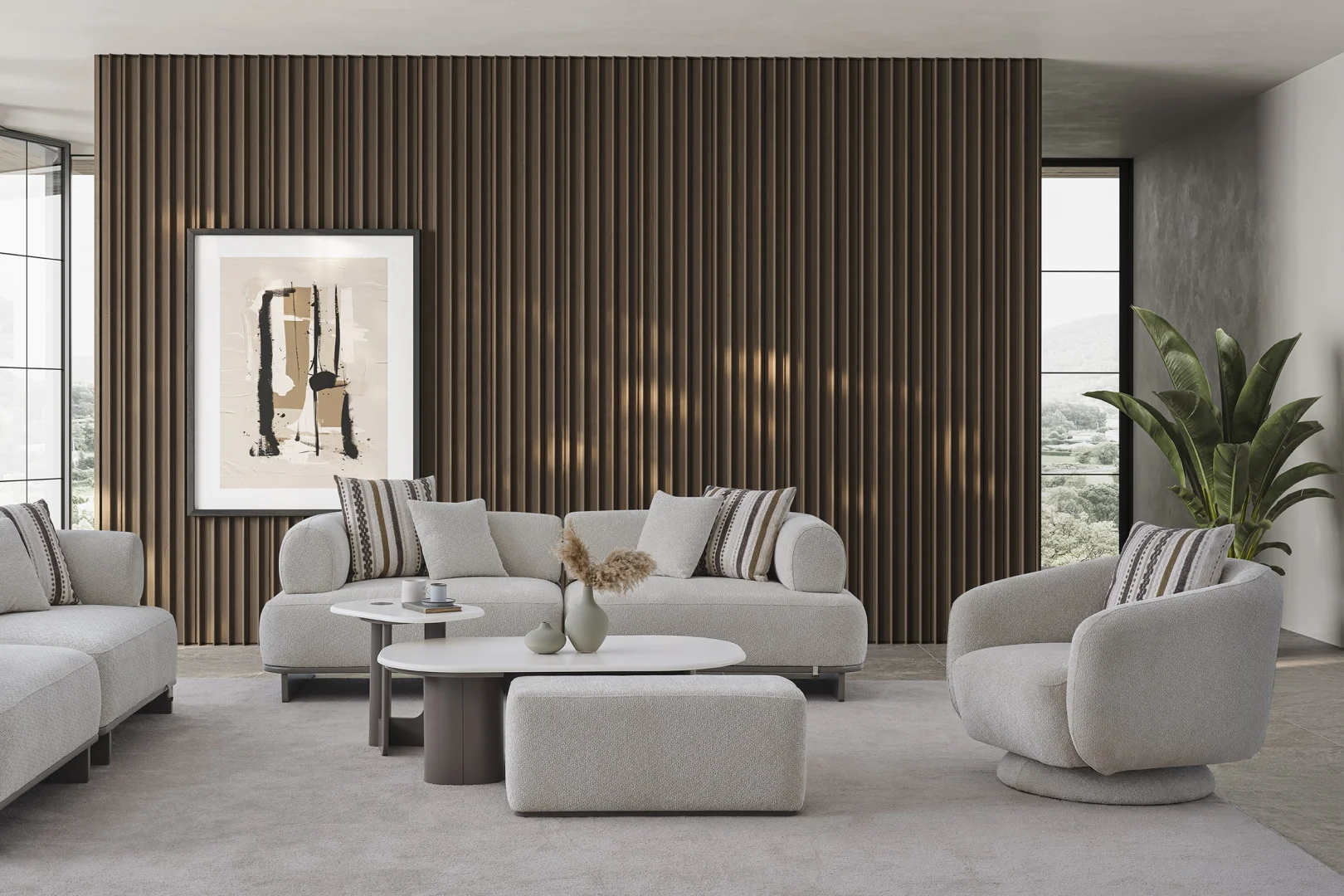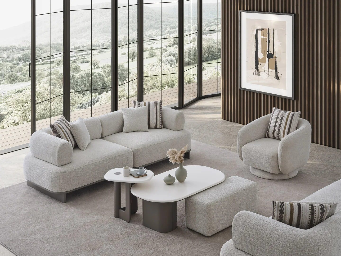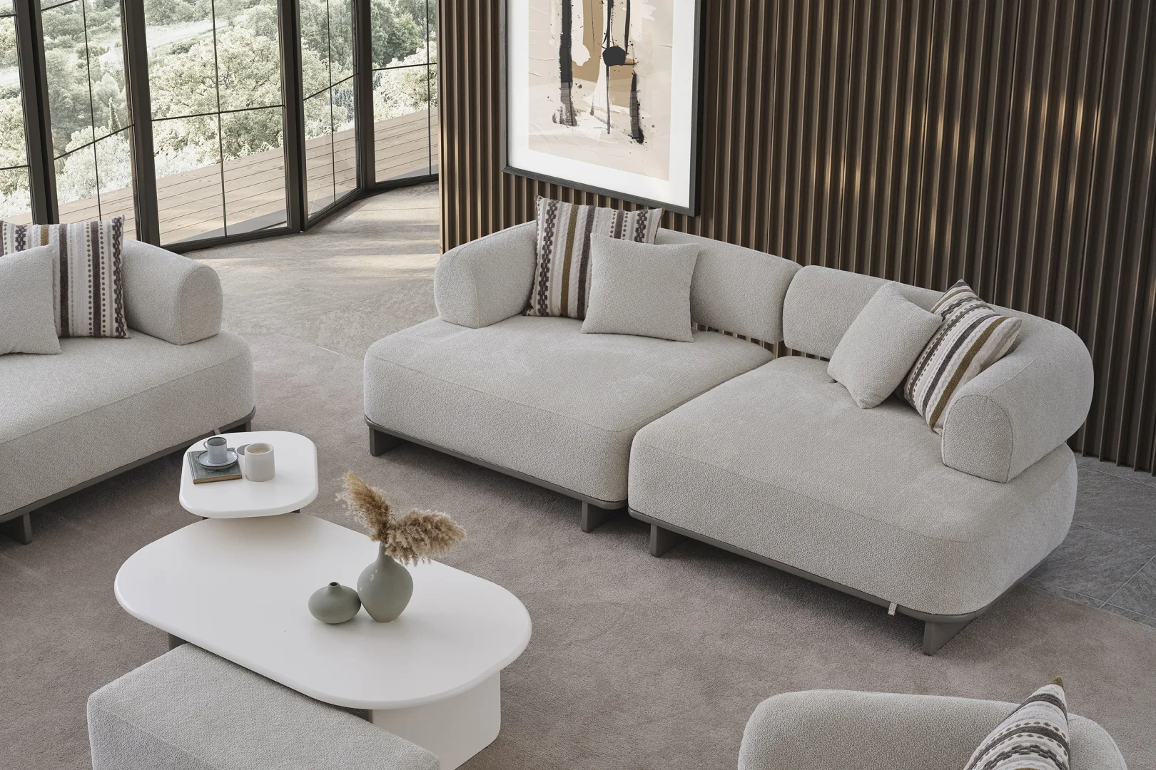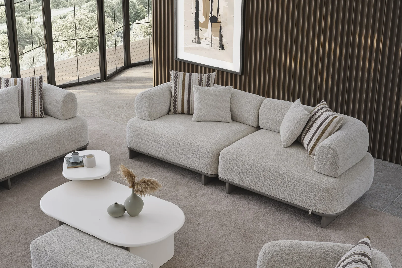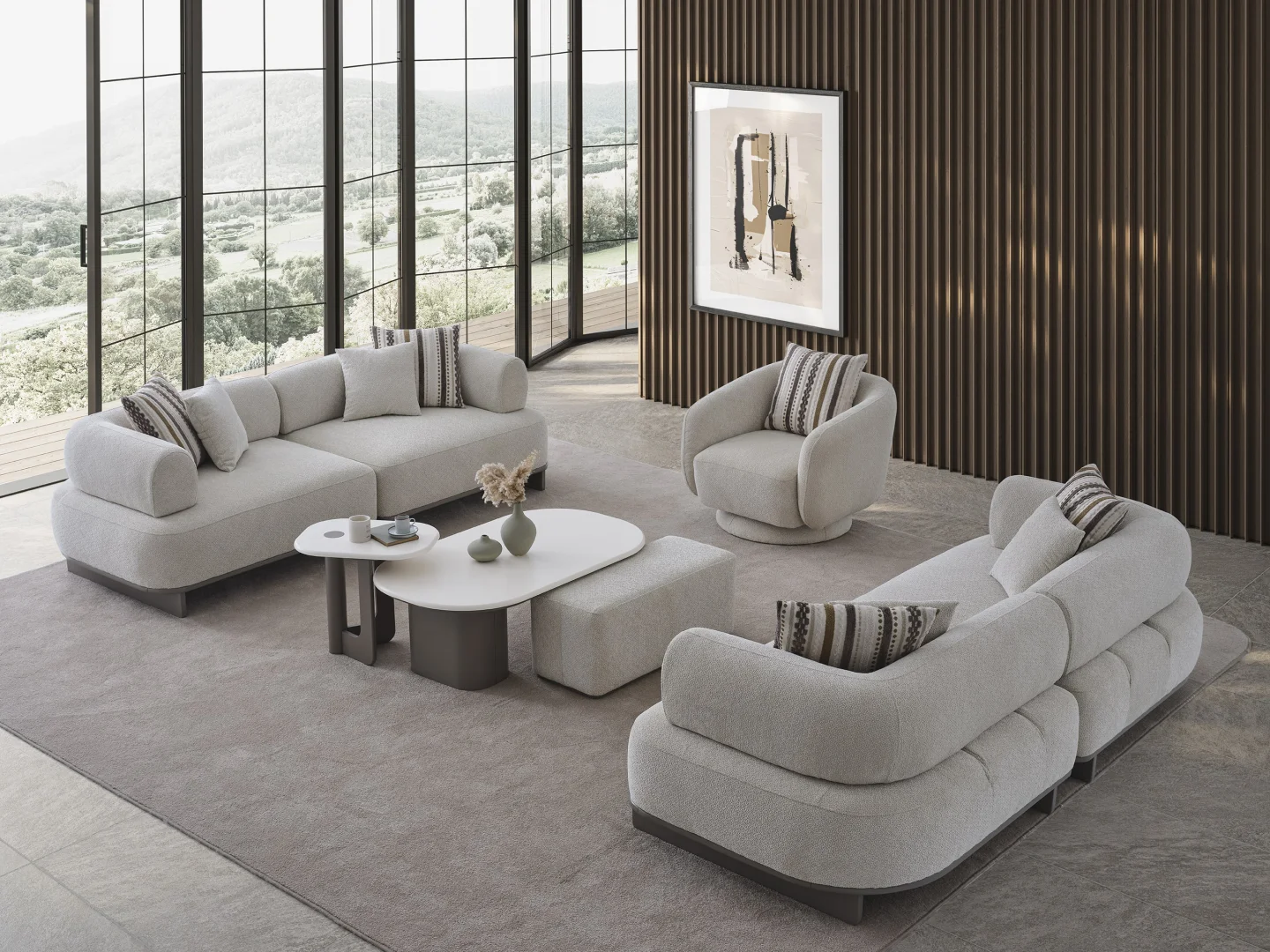 The Dior Sofa Set adds sophisticated elegance to your living spaces with its modern lines and refined silhouette. Featuring rounded contours and a soft-textured premium fabric, it offers an exceptionally comfortable seating experience. Its spacious sitting area, modular structure, and aesthetic design allow perfect harmony with various interior styles.